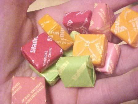 I really should be mad right now. I should be hating a certain person for ruining Starburst and Twizlers for me! But I can't because last night was sooooooooooo much fun! But, yeah right now I have a pile of the light pink Starbursts sitting in front of me but I can't eat them because they make me think of last night. And......yeah.........